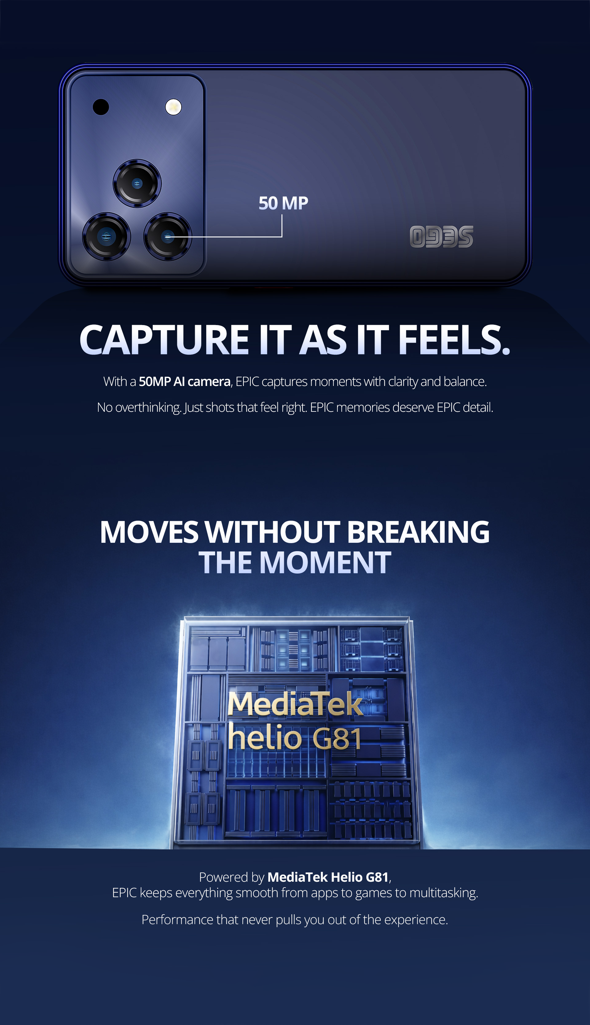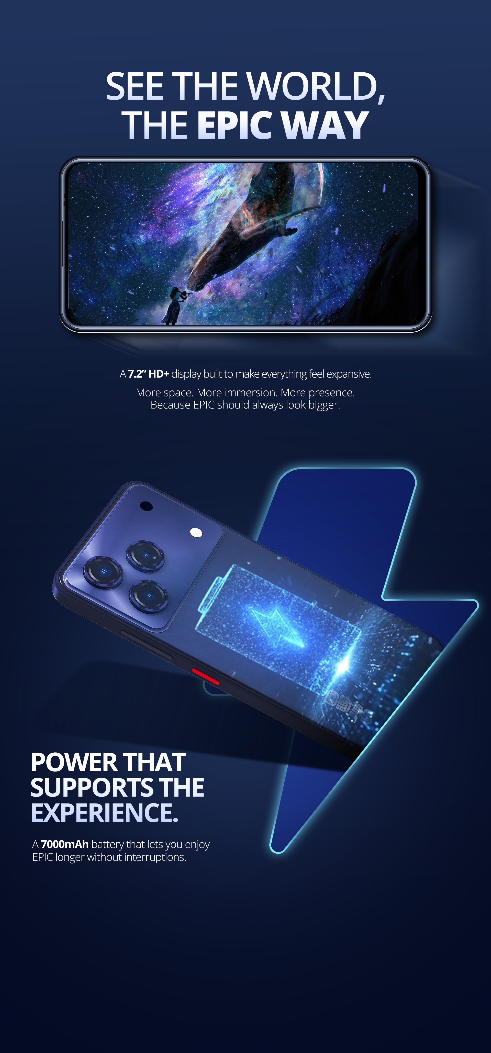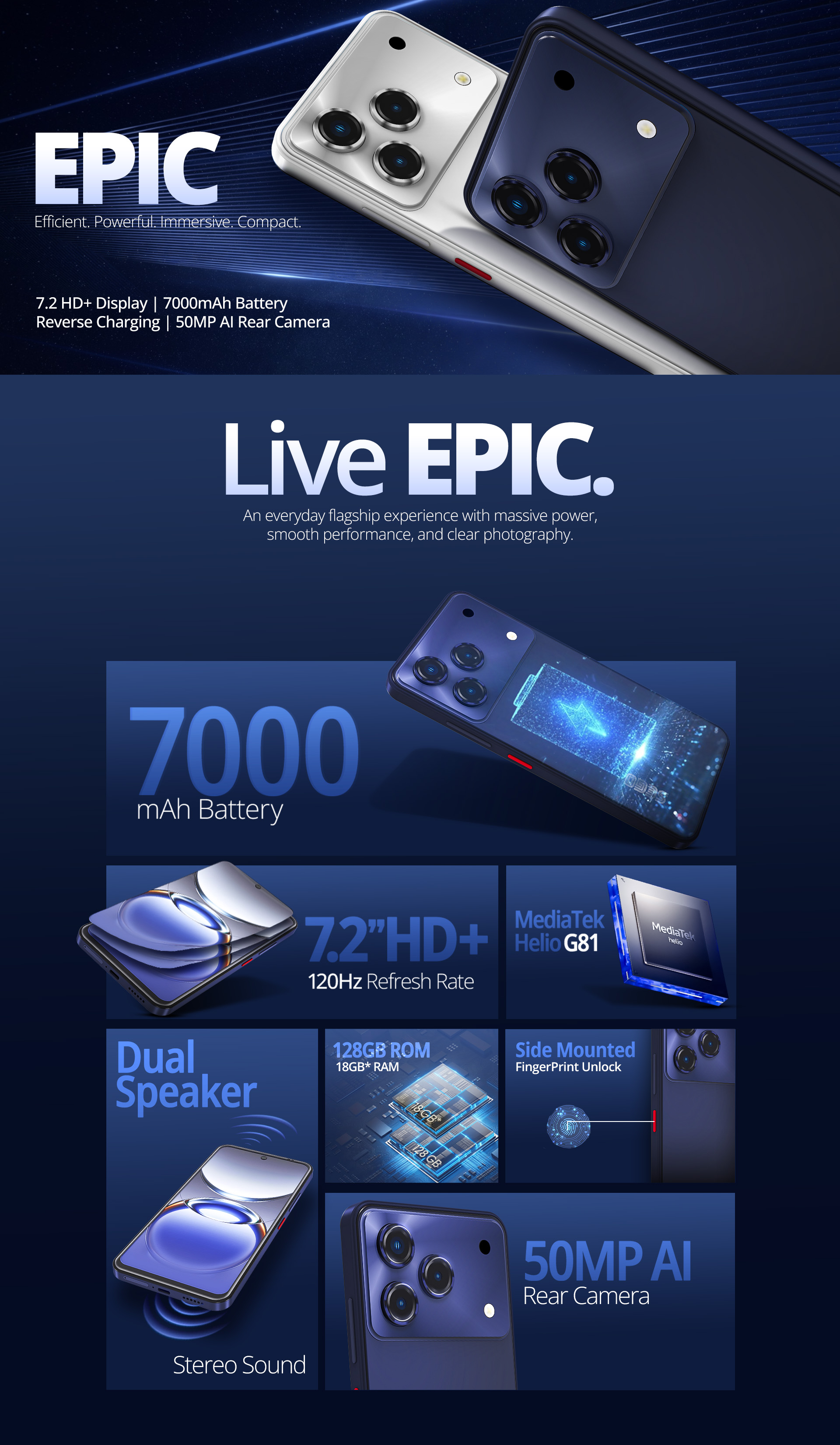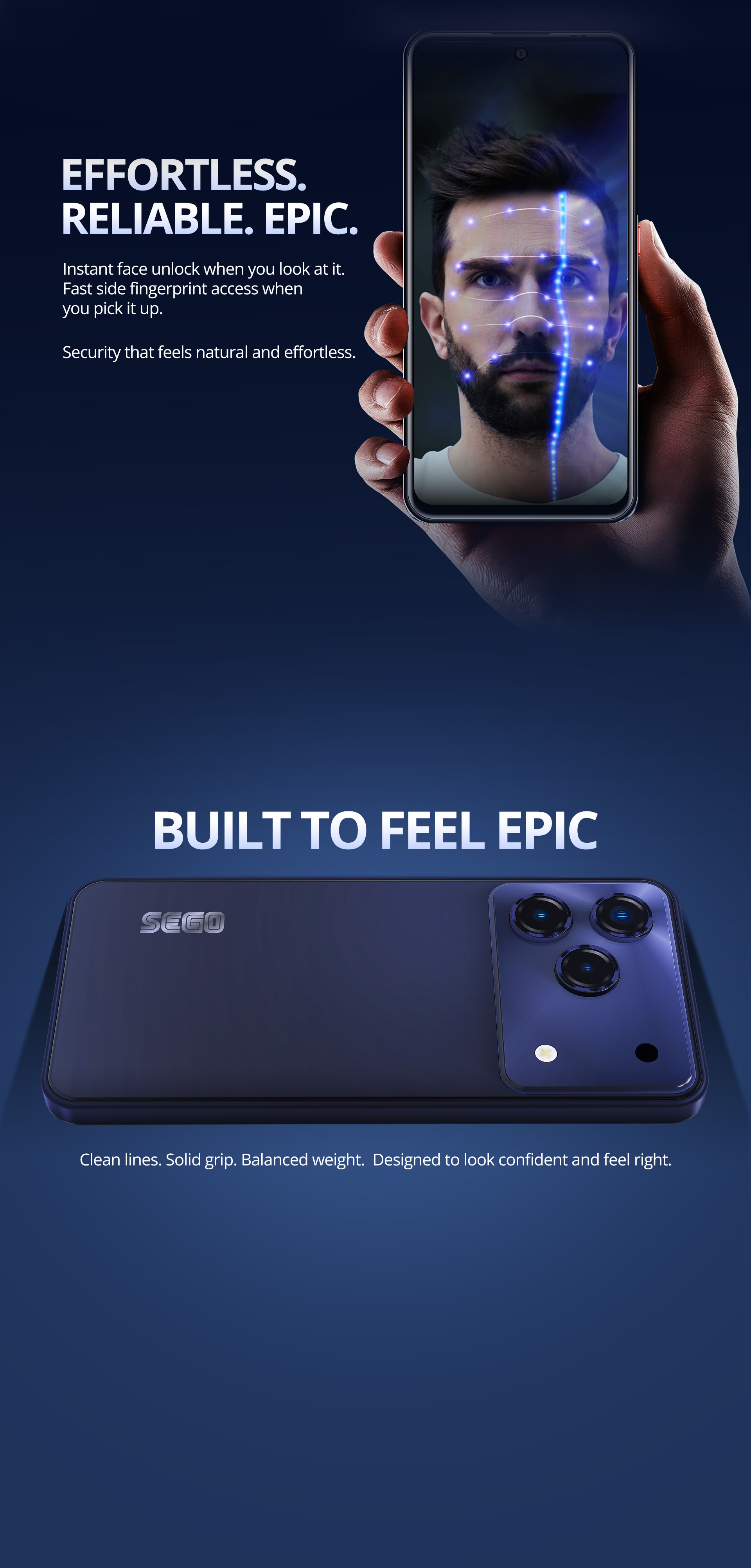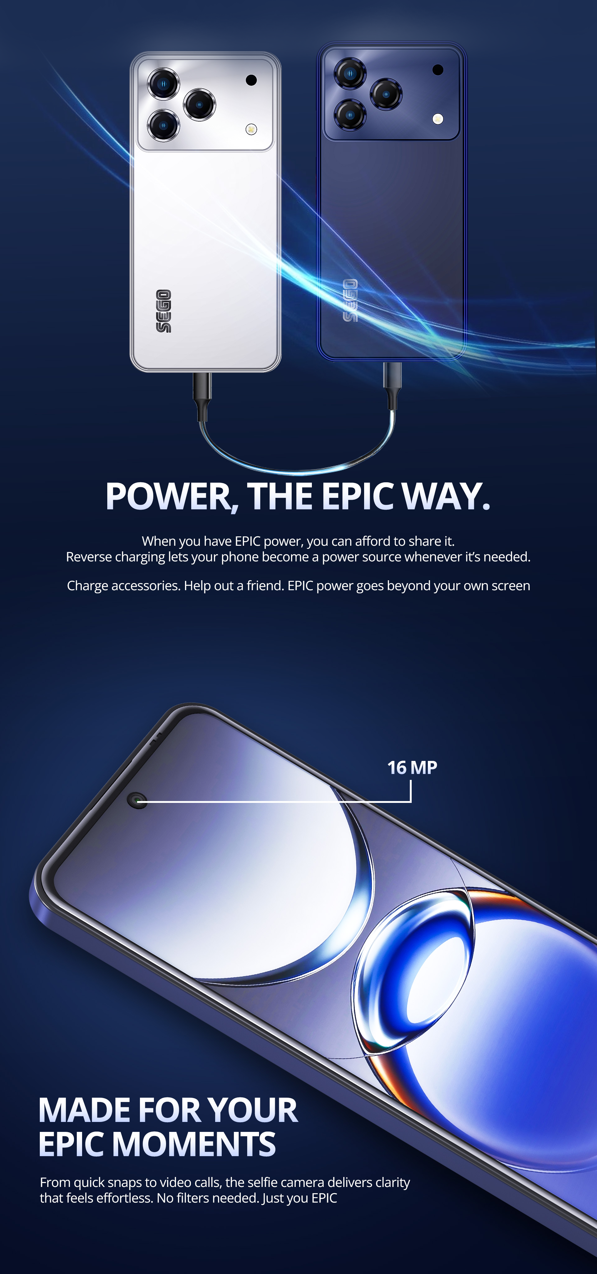 Capture life's moments in stunning detail with the 50MP Triple camera and snap vibrant selfies with the 16MP front camera. Equipped with a massive 7000mAh battery and the SEGO Epic keeps you connected all day with minimal charging interruptions.