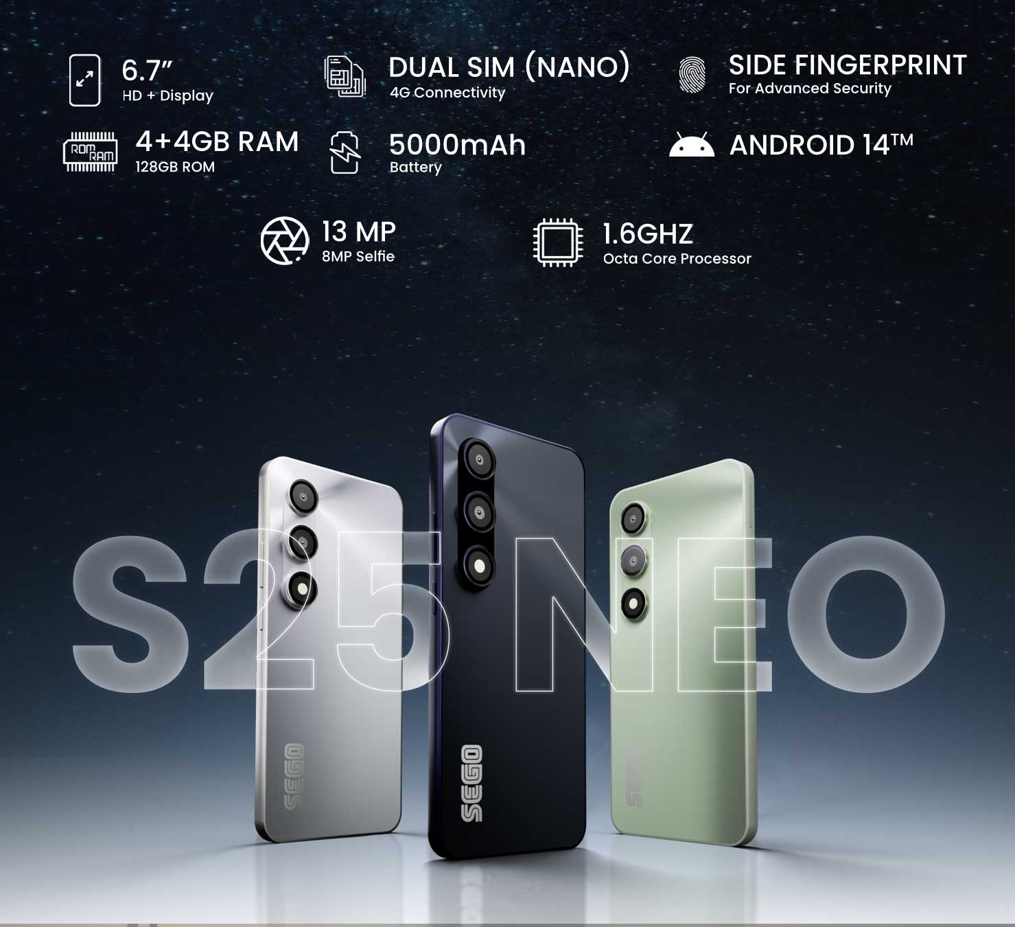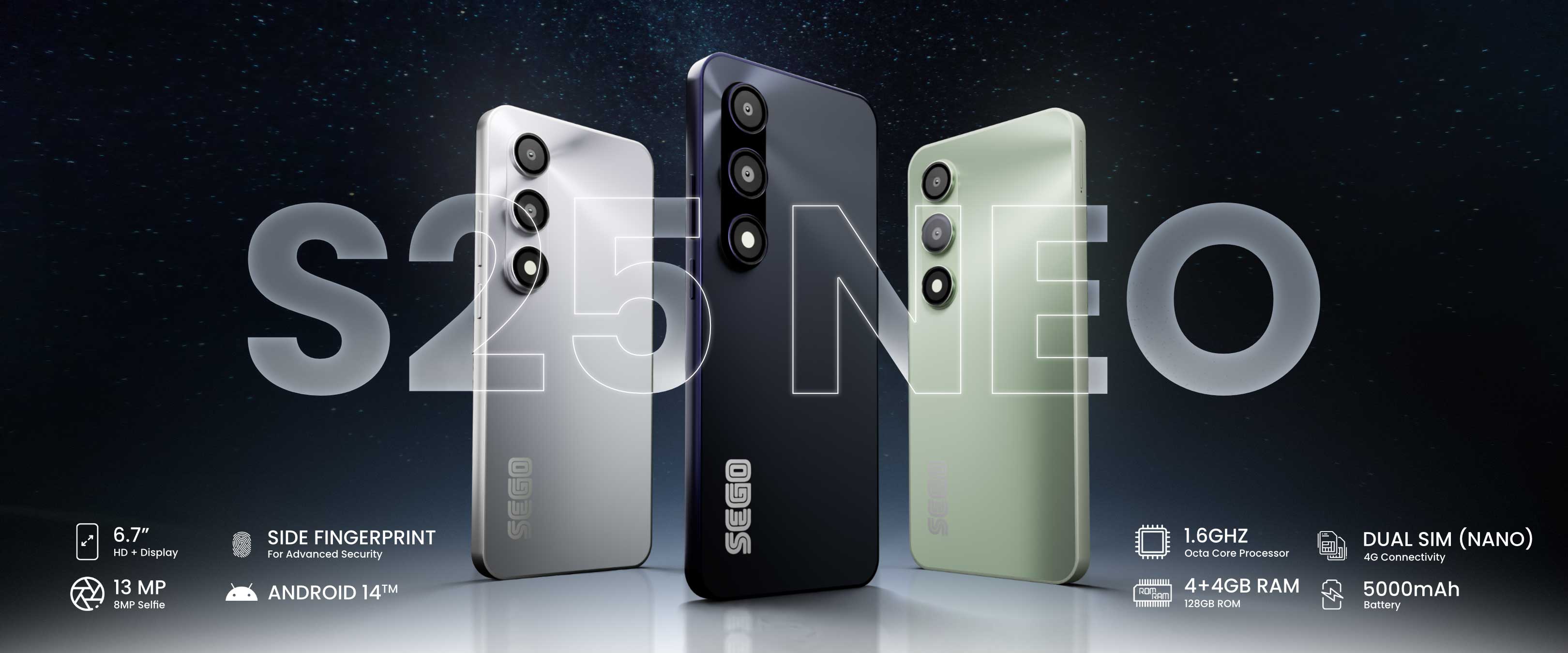 Running on the latest Android 14™, and featuring side fingerprint unlocking, dual SIM support, and 4G connectivity, the SEGO S25 Neo brings together everything you need in one smart, stylish device. Available in three dazzling colors—Starlight Blue, Neon Mint, and Moonlight Jade—the S25 Neo is your perfect digital companion for work and play.