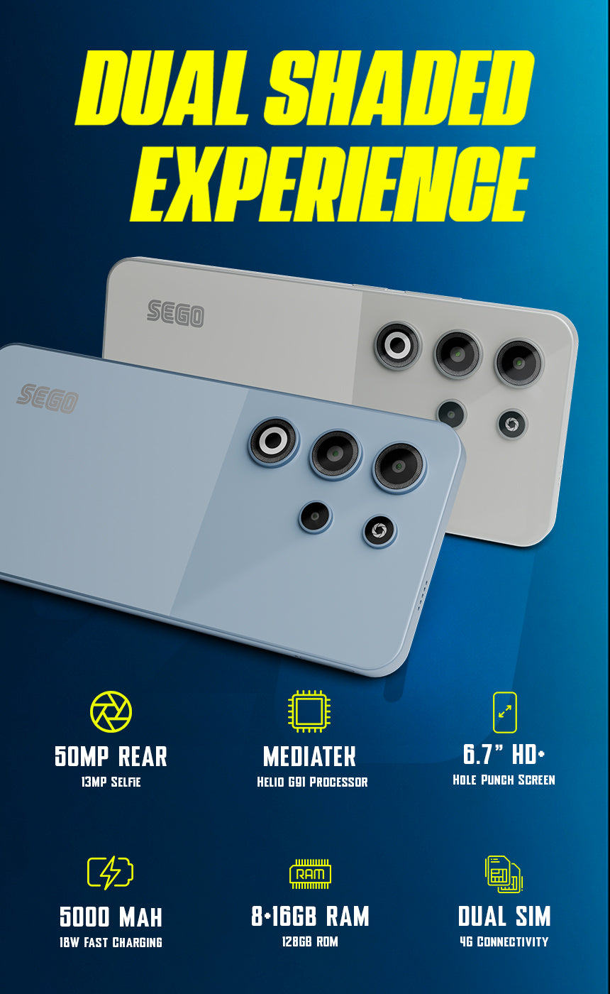 The SEGO S25 is built to deliver a premium all-round experience with a perfect balance of performance, style, and efficiency. Featuring a 6.7" HD+ display, it provides immersive visuals with vibrant clarity, ideal for streaming, gaming, and browsing. Powered by the MediaTek Helio G91 chipset, this device ensures smooth multitasking and responsive app performance.