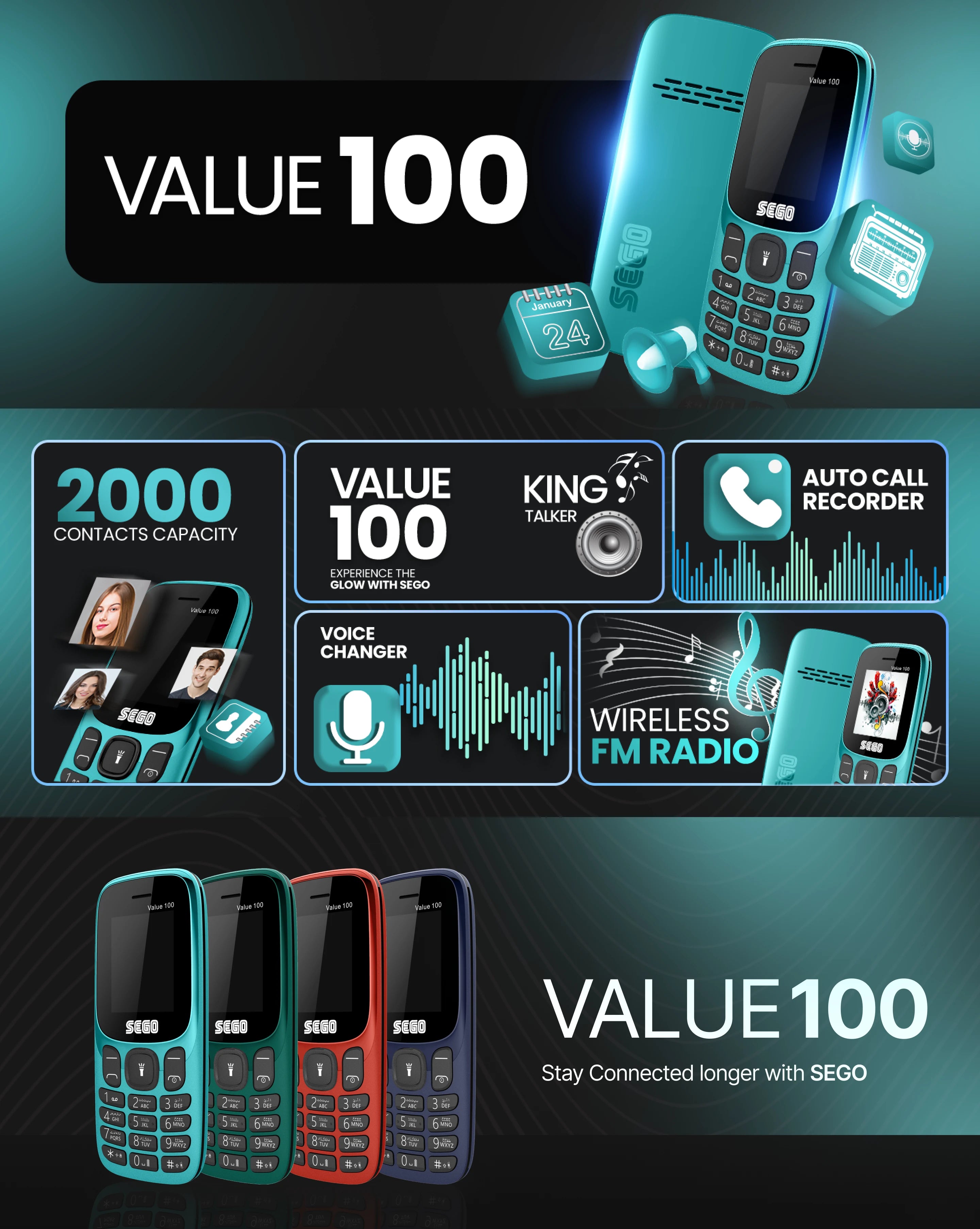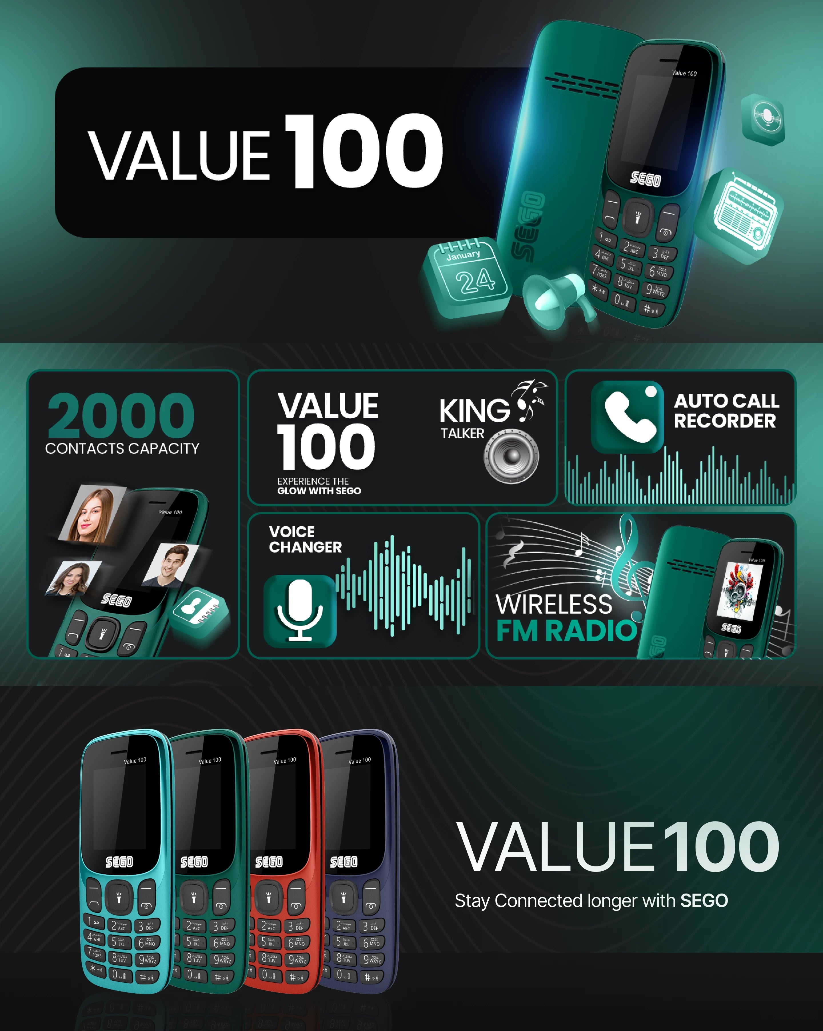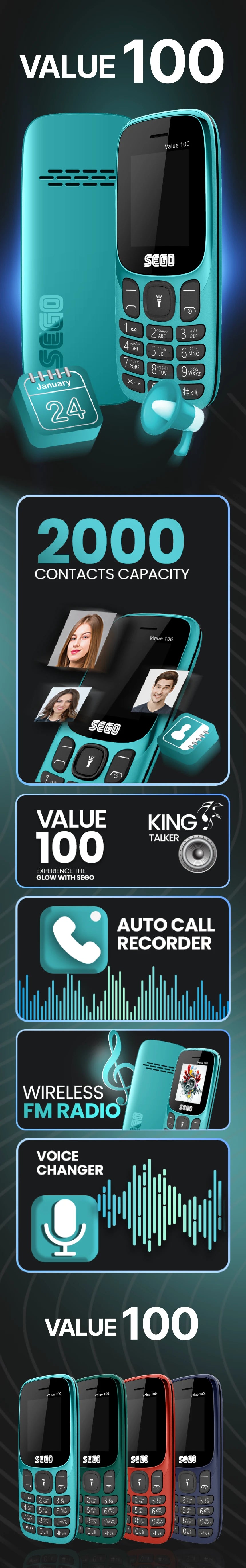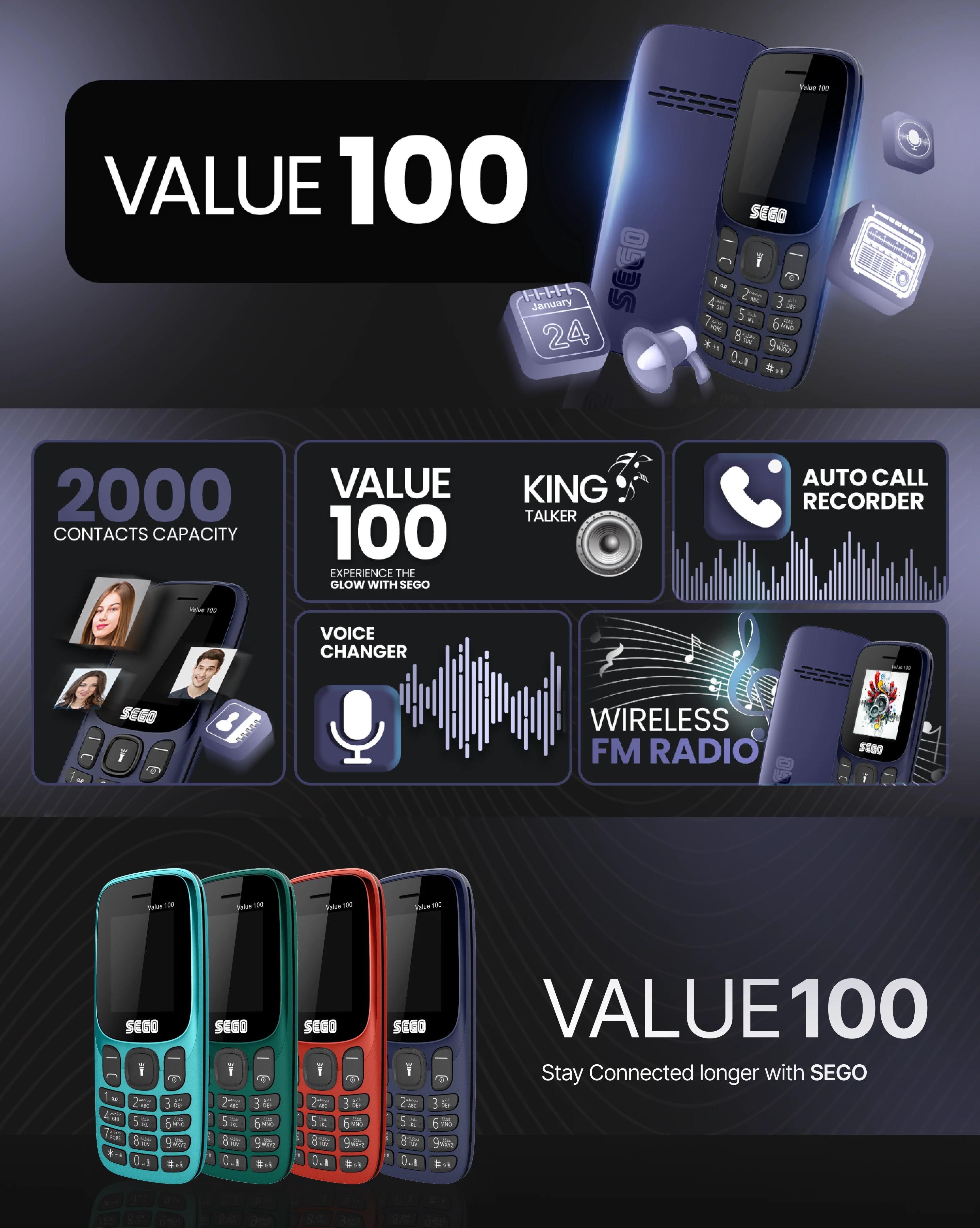 Enjoy crystal-clear sound quality for calls and music with its powerful speaker. Designed for simplicity and reliability, the SEGO Value 100 is an ideal choice for anyone seeking a straightforward and efficient mobile device.