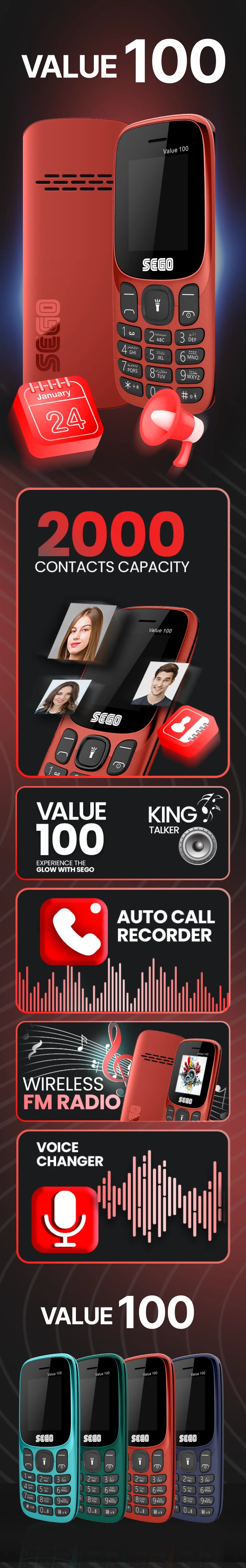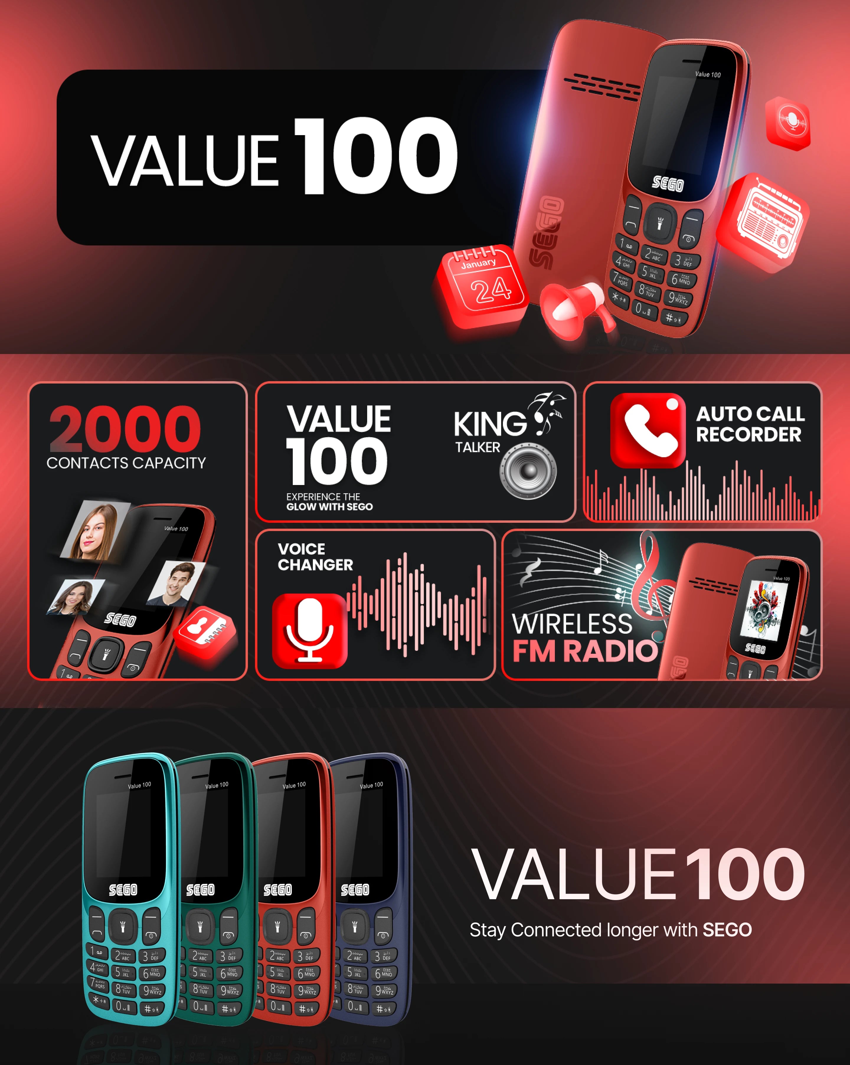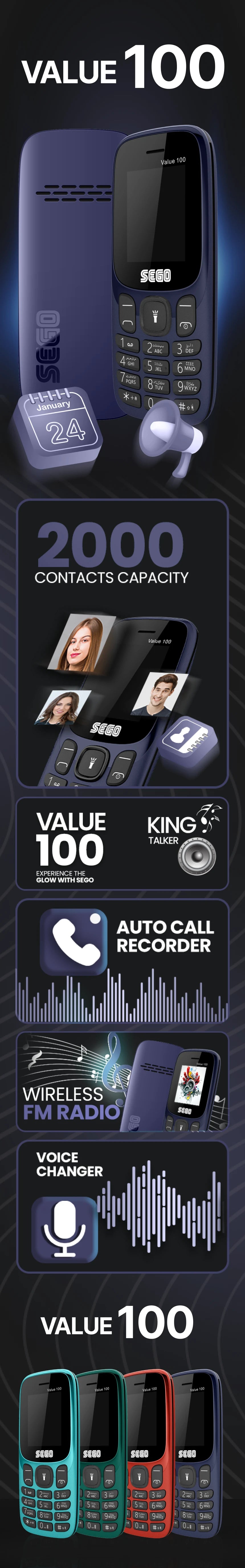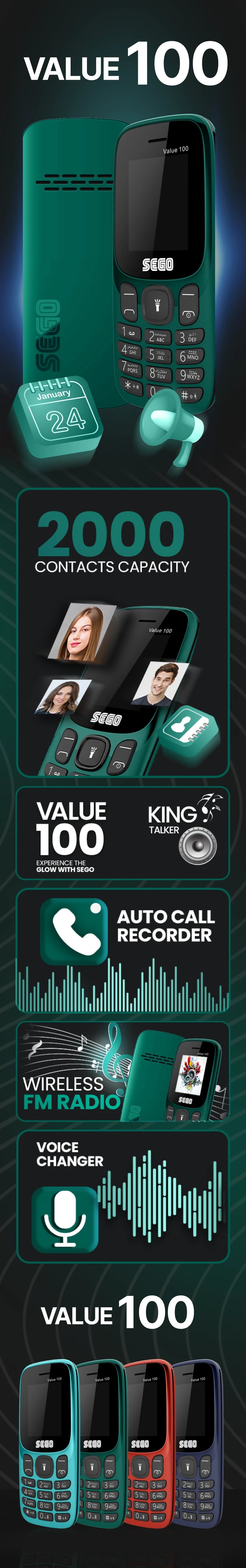 Enjoy crystal-clear sound quality for calls and music with its powerful speaker. Designed for simplicity and reliability, the SEGO Value 100 is an ideal choice for anyone seeking a straightforward and efficient mobile device.