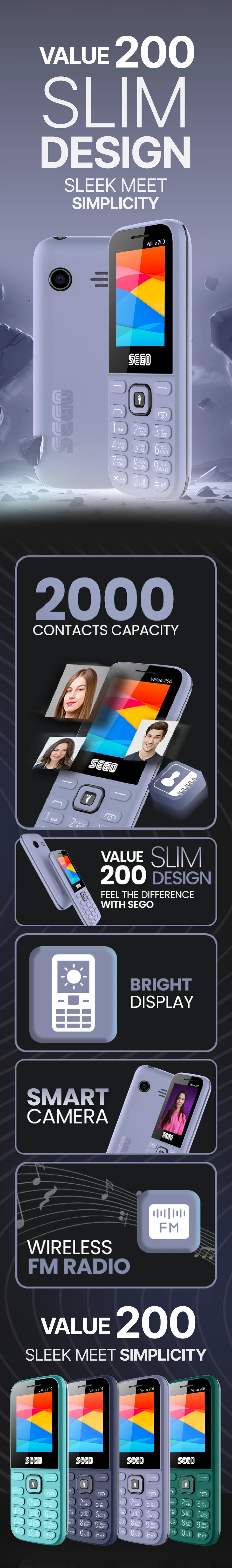 The SEGO Value 200 is the perfect device for those who value simplicity and efficiency in a compact design. Featuring a 2.0-inch display, it offers a clear and user-friendly viewing experience. Designed for smooth performance, it handles your essential tasks with ease.